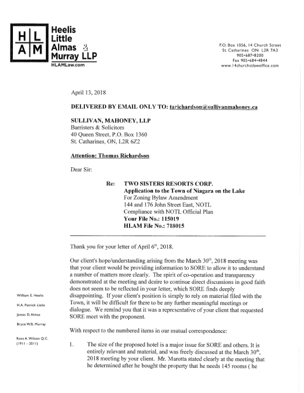 SORE's lawyers responded May 11 to the April 30 letter from Benny Marotta's lawyer. The SORE letter questions Marotta representative's Maurizio Rogato's sincerity in telling Council that the Marotta group is open and transparent given the ongoing refusal of Marotta's lawyer to provide any information to SORE.